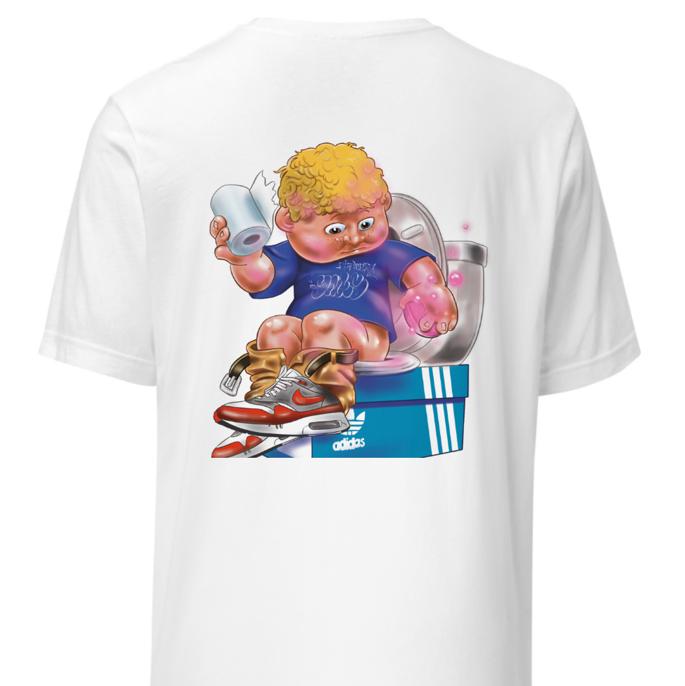Who needs a crown when you’ve got kicks like these? Meet the Garbage Throne Kid, doing his thing up on the three stripes box, flexing Air Max heat while handling business, bubbles and all. A perfectly wrong, perfectly right streetwear piece that doesn’t take itself too seriously – but will turn heads everywhere you go.